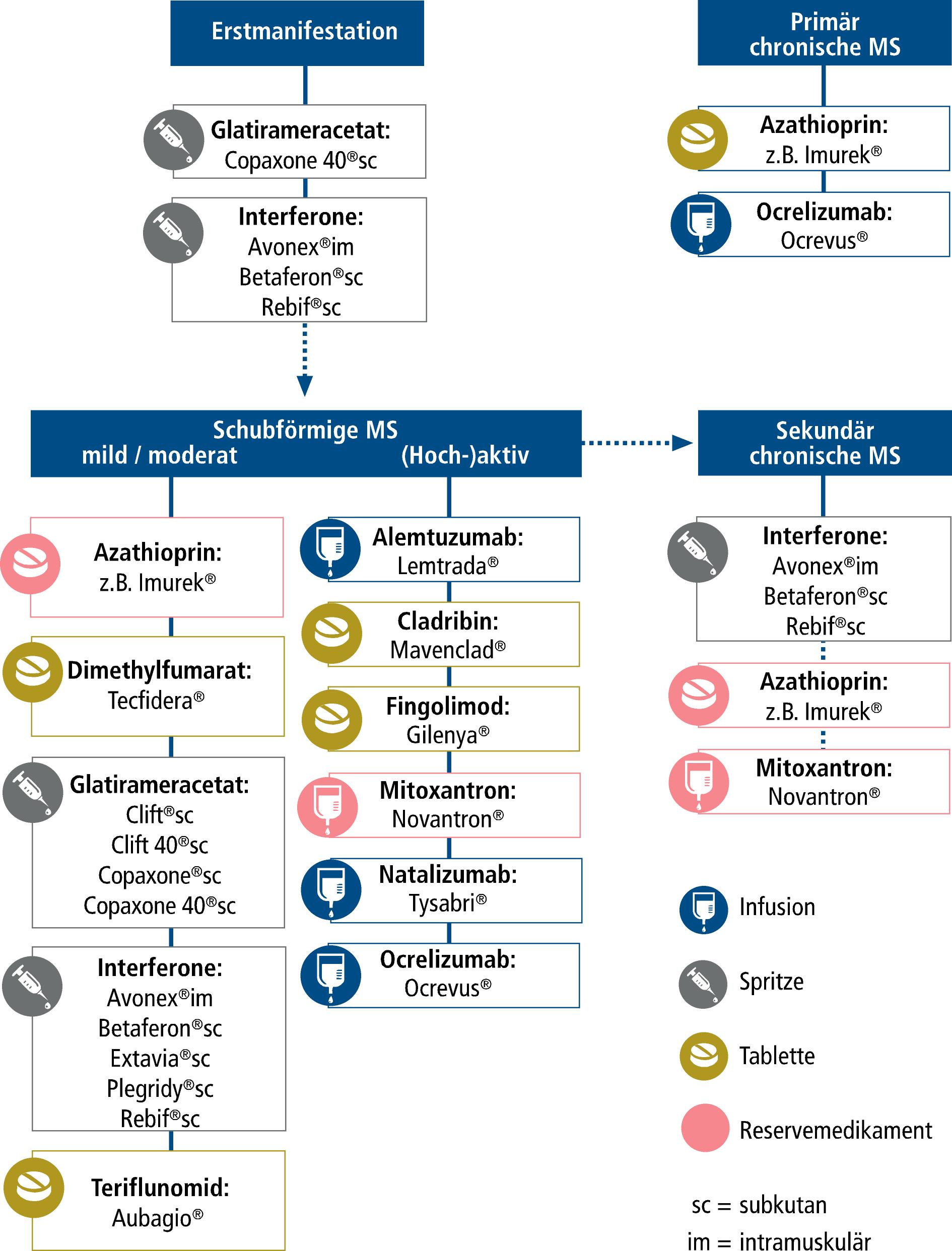 Die nachfolgende Grafik zeigt, welche medikamentösen Therapien für die verschiedenen Verlaufsformen der MS bestehen. In den folgenden Kapiteln können Sie mehr zu den einzelnen Medikamenten erfahren.