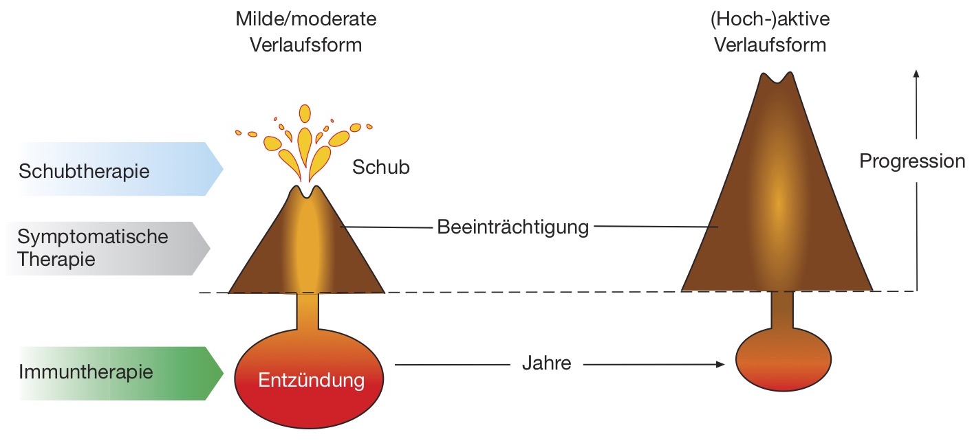 Die Immuntherapie lässt sich in die Behandlung von Schüben der MS einerseits und die Dauertherapie andererseits unterteilen. In der Dauertherapie wird von einer Behandlung über Jahre ausgegangen. Einige Untersuchungen haben Patienten bis zu 20 Jahren unter Therapie verfolgt. Ob auch eine Therapie alleine in aktiven Phasen der Erkrankung sinnvoll ist, wie es bei anderen chronischen Erkrankungen untersucht wurde, ist nicht geklärt.