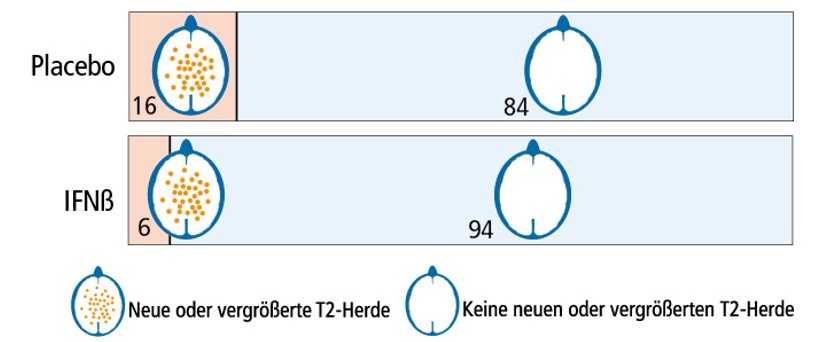 Studien vergleichen den zweijährigen Verlauf nach der Erstmanifestation unter der Therapie mit Beta-Interferonen und unter der Einnahme eines Placebos. Gezeigt wurde, dass unter Beta-Interferonen weniger neue Läsionen entstehen.