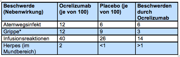 In der Tabelle sind Nebenwirkungen aufgeführt, die aus der Zulassungsstudie ORATORIO berichtet wurden und bei mindestens 2% der Patienten auftraten. Angegeben ist die Patientenzahl von 100 Patienten. In der Grafik zu Anfang des Kapitels sowie in der Faktenbox weiter unten werden jedoch lediglich die wichtigsten Nebenwirkungen dargestellt.