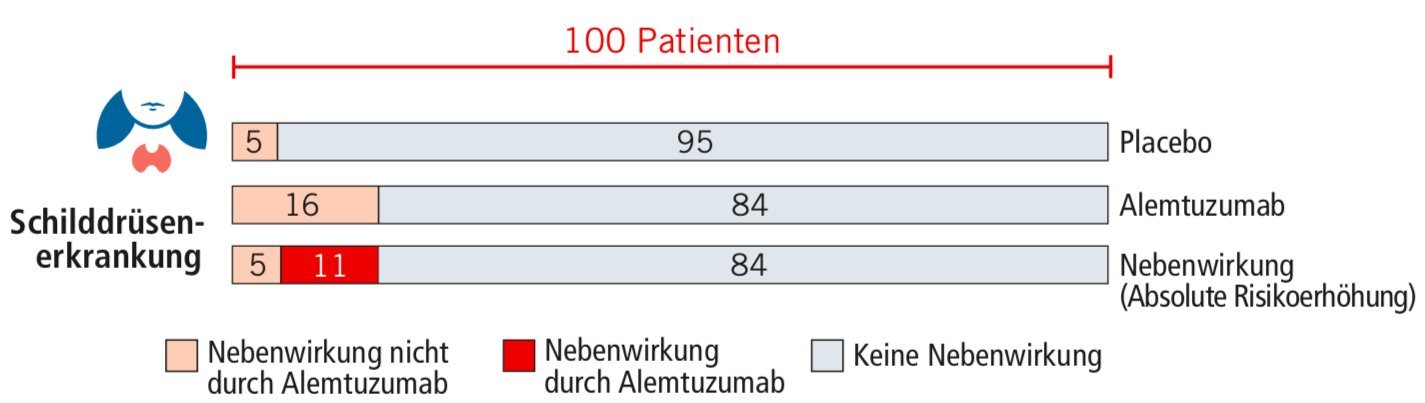Beispiel Schilddrüsenerkrankung: In der Kontrollgruppe kam es bei 5 von 100 Patienten zu einer Schilddrüsenerkrankung, in der Alemtuzumab-Gruppe waren es hingegen 16 von 100 Patienten. Das bedeutet, dass es in der Alemtuzumab-Gruppe bei 11 Patienten mehr zu einer Schilddrüsenerkrankung kam als in der Kontrollgruppe. Die Zahlen stellen also den Unterschied in der Nebenwirkungshäufigkeit zwischen der Alemtuzumab- und der Kontrollgruppe dar.