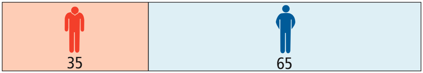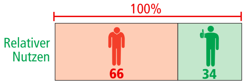 Man kann die Wirkung aber auch nur bezogen auf die Patienten mit Schüben darstellen. In der Interferon-Gruppe haben 53 Patienten einen Schub, in der Alemtuzumab-Gruppe sind es nur 35, also 18 weniger. 18 von 35 sind in Prozent umgerechnet 34%. Das entspricht dem relativen Nutzen (oder der relativen Risikoreduktion).