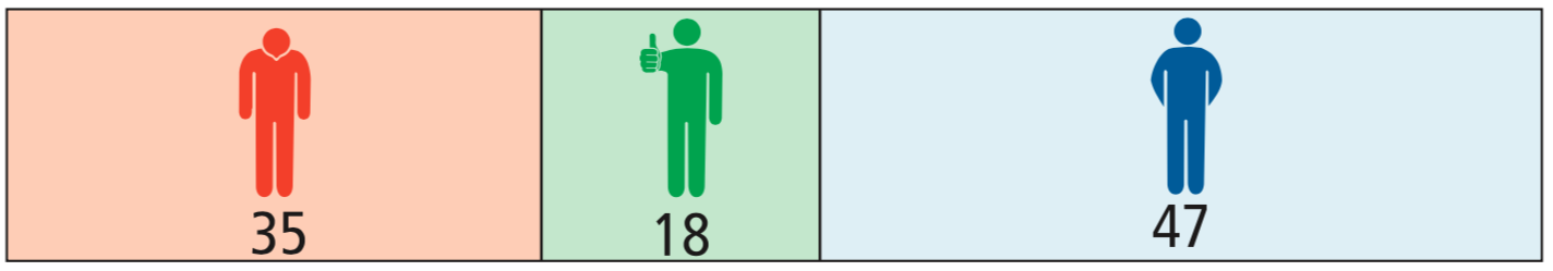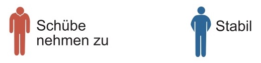 Männchen mit "hängendem" Kopf werden für das Auftreten von Schüben genutzt. Männchen mit Händen auf dem Rücken stehen für Stabilität und Männchen mit Daumen stehen für die Anzahl der Patienten, bei denen ein Medikament wirksam das Auftreten von Schüben verhindert. Die Werte erscheinen auf 100 Patienten bezogen. Dargestellt werden: