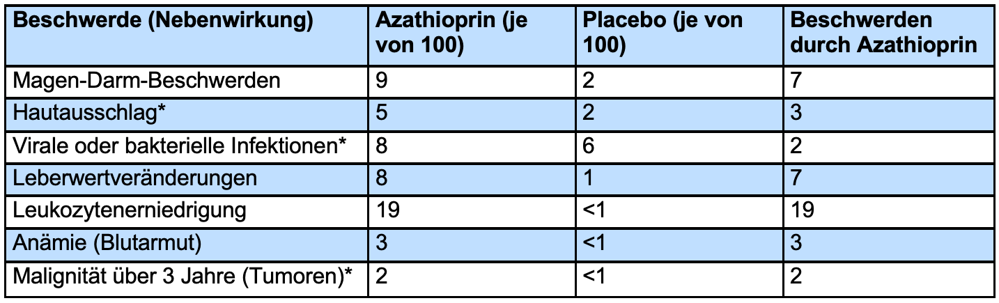 *Bei diesen Nebenwirkungen war der Unterschied zwischen der Azathioprin- und der Placebo-Gruppe nicht statistisch signifikant.