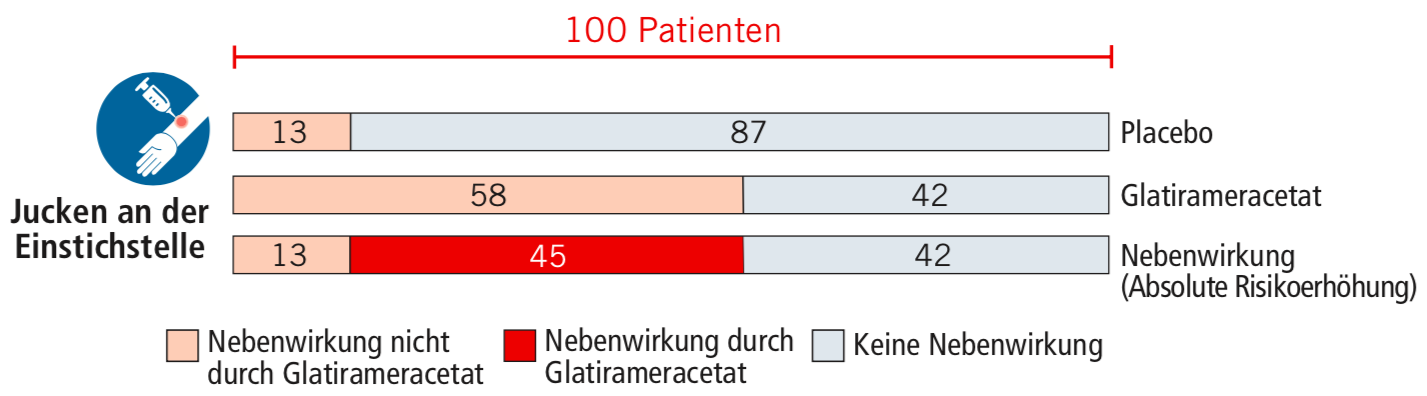 Beispiel Jucken an der Einstichstelle: In der Placebo-Gruppe hatten 13 von 100 Patienten ein Jucken an der Einstichstelle, in der Glatirameracetat-Gruppe waren es hingegen 58 von 100 Patienten. Das bedeutet, dass in der Glatirameracetat-Gruppe 45 Patienten mehr ein Jucken an der Einstichstelle hatten als in der Placebo-Gruppe. Die Zahlen stellen also den Unterschied in der Nebenwirkungshäufigkeit zwischen der Glatirameracetat- und der Placebo-Gruppe dar.