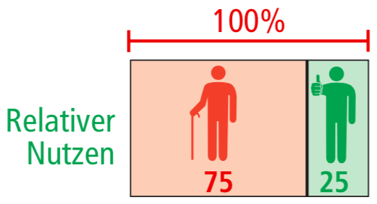 Man kann die Wirkung aber auch nur bezogen auf die Patienten mit einer Zunahme der Behinderung darstellen. In der Placebo-Gruppe haben 28 Patienten eine Zunahme der Behinderung, in der Glatirameracetat-Gruppe sind es nur 21, also 7 weniger. 7 von 28 sind in Prozent umgerechnet 25%. Das entspricht dem relativen Nutzen (oder auch der relativen Risikoreduktion).