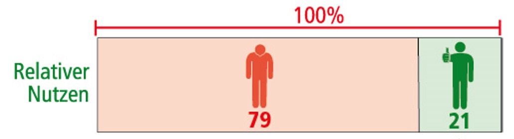 Der relative Nutzen der Therapie beschreibt die Wikrung ausschließlich bezogen auf die Patienten mit einen oder mehreren Schüben. In der Placebo-Gruppe waren dies 70 Patienten, in der Beta-Interferon-Gruppe 15 Patienten weniger. 15 von 70 ergibt einen Anteil von 21%, der einen Vorteil durch die Beta-Interferontherapie erfährt.