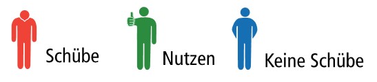 Rote Männchen mit "hängendem" Kopf werden für das Auftreten von Schüben genutzt. Blaue Männchen mit Händen auf dem Rücken stehen für Stabilität und grüne Männchen mit Daumen stehen für die Anzahl der Patienten, bei denen ein Medikament wirksam das Auftreten von Schüben verhindert.