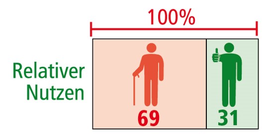 Der relative Nutzen betrachtet darüberhinaus nur die Patienten mit einer Zunahme der Behinderung. In der Placebogruppe erlitten 29 Patienten eine Zunahem der Behidnerung, in der Beta-Interferongruppe sind es 9 Patienten weniger. Dies entspricht einem Anteil und somit relativem Nutzen von 31% (9 von 29).