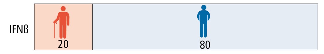 Von 100 Patienten, die mit einem Beta-Interferon behandelt werden, zeigten 20 Patienten eine Behinderungszunahme, während 80 Patienten stabil blieben: