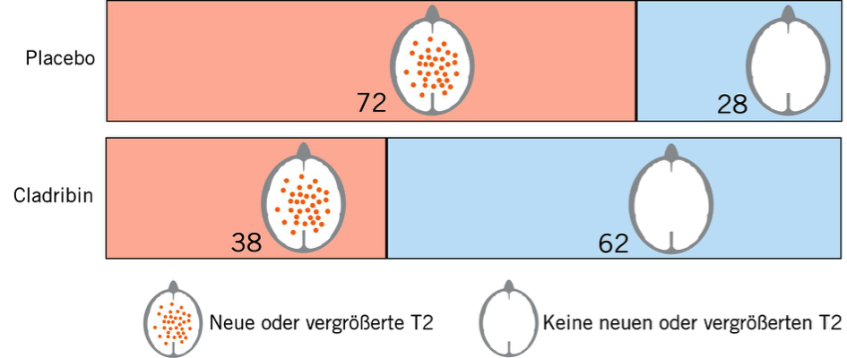 Fasst man neue T2-Herde und Kontrastmittel anreichernde Herde als gesamte MRT-Aktivität zusammen, so fanden sich in der Placebo-Gruppe 25% und in der Cladribin-Gruppe 60% ohne MRT-Aktivität.
