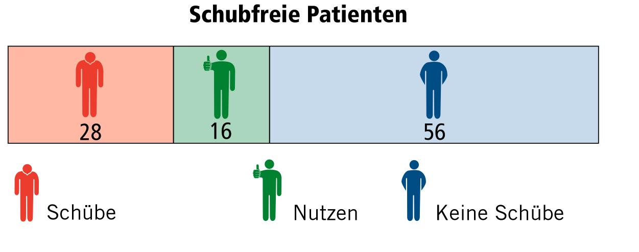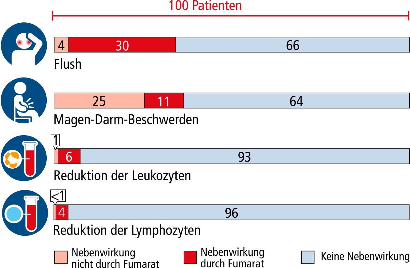 der Patienten reduziert Fumarat die Schubrate und hält die Zunahme der Beeinträchtigung auf. An wichtigen Nebenwirkungen treten auf: Flush (Gesichtsrötung), Magen-Darm-Beschwerden, Verminderung von weißen Blutzellen. Zur Überwachung muss alle 6 – 8 Wochen ein Blutbild gemacht werden. Das Medikament wird in der Apotheke unter dem Namen Tecfidera® vertrieben.