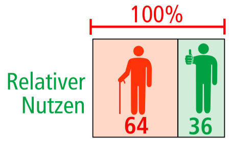 Man kann die Wirkung aber auch nur bezogen auf die Patienten mit einer Zunahme der Behinderung darstellen. In der Placebo-Gruppe haben 22 Patienten eine Zunahme der Behinderung, in der Fumarat-Gruppe sind es nur 14, also 8 weniger. 8 von 22 sind in Prozent umgerechnet 36%. Das entspricht dem relativen Nutzen (oder auch der relativen Risikoreduktion).