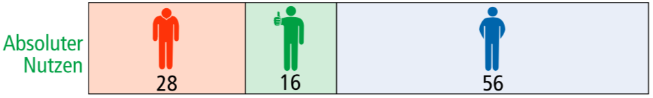 Wenn nun dargestellt werden soll, wie viele Patienten einen absoluten Nutzen durch die Therapie haben, muss berechnet werden, wie viele Patienten zusätzlich zur Behandlung mit Placebo schubfrei bleiben. Oder anders gesagt, wie viele Patienten weniger einen Schub erleiden.