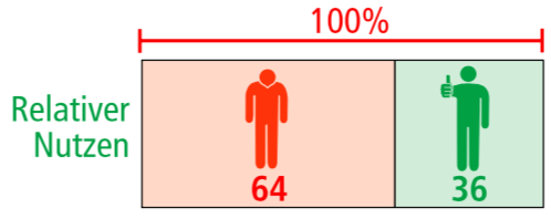 Man kann die Wirkung aber auch nur bezogen auf die Patienten mit Schüben darstellen. In der Placebo-Gruppe haben 44 Patienten einen Schub, in der Fumarat-Gruppe sind es nur 28, also 16 weniger. 16 von 44 sind in Prozent umgerechnet 36%. Das entspricht dem relativen Nutzen (oder der relativen Risikoreduktion).