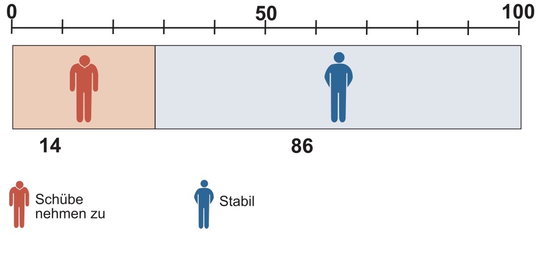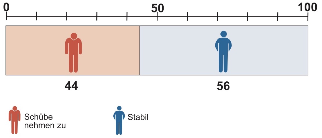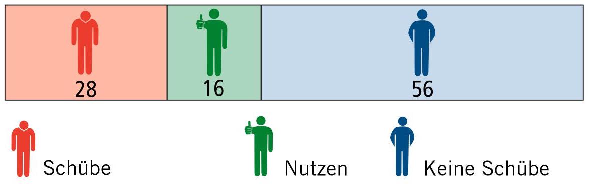 Statt 44 Patienten erleiden jetzt nur 28 Patienten einen oder mehrere Schübe, anders gesagt: statt 56 Patienten bleiben nun 72 Patienten schubfrei.