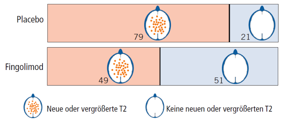 21% der Patienten in der Placebo-Gruppe und 51% in der Fingolimod-Gruppe waren über die Studiendauer frei von neuen oder vergrößerten T2-Herden.