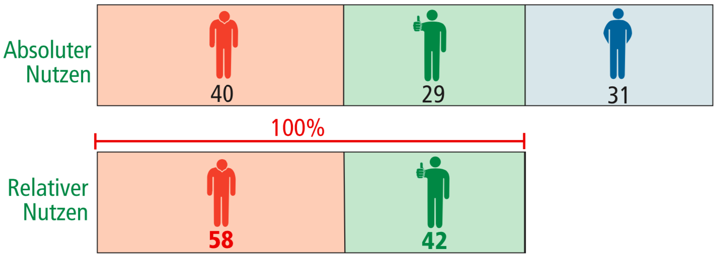Wenn nun dargestellt werden soll, wie viele Patienten einen absoluten Nutzen durch die Therapie haben, muss berechnet werden, wie viele Patienten zusätzlich zur Behandlung mit Placebo schubfrei bleiben. Oder anders gesagt, wie viele Patienten weniger einen Schub erleiden.