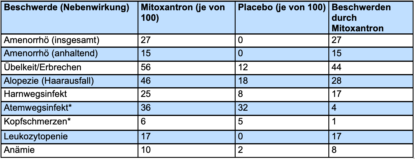 *Bei diesen Nebenwirkungen war der Unterschied zwischen der Mitoxantron- und der Placebo-Gruppe nicht statistisch signifikant.