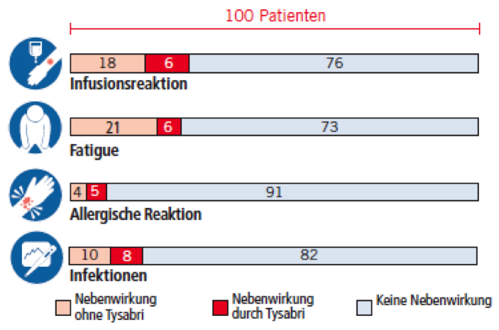 Natalizumab ist zugelassen für Erwachsene mit hochaktiver, schubförmig remittierend verlaufender Multipler Sklerose (MS). Es wird als Infusion alle 4 Wochen verabreicht. Bei einem Teil der Patienten reduziert Natalizumab die Schubrate und bremst die Zunahme der MS-bedingten Beeinträchtigungen. An wichtigen Nebenwirkungen treten auf: allergische Reaktionen und gelegentlich die progressive multifokale Leukenzephalopathie (PML). Zur Überwachung muss eine Risikoerkennung für PML mit Bluttest und MRT, evtl. auch eine Nervenwasserentnahme durchgeführt werden. Das Medikament wird in der Apotheke unter dem Namen Tysabri® vertrieben.