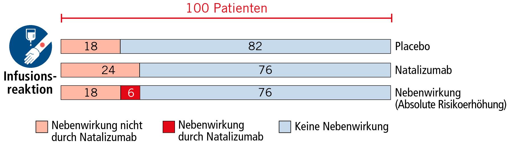 Beispiel Infusionsreaktion: In der Placebo-Gruppe hatten 18 von 100 Patienten Magen-Darm-Beschwerden, in der Natalizumab-Gruppe waren es hingegen 24 von 100 Patienten. Das bedeutet, dass in der Natalizumab-Gruppe 6 Patienten mehr Infusionsreaktionen hatten als in der Placebo-Gruppe. Die Zahlen stellen also den Unterschied in der Nebenwirkungshäufigkeit zwischen der Natalizumab- und der Placebo-Gruppe dar.