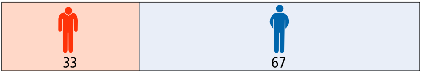 Man kann die Wirkung aber auch nur bezogen auf die Patienten mit Schüben darstellen. In der Interferon-Gruppe haben 33 Patienten einen Schub, in der Ocrelizumab-Gruppe sind es nur 20, also 13 weniger. 13 von 33 sind in Prozent umgerechnet 39%. Das entspricht dem relativen Nutzen (oder der relativen Risikoreduktion).
