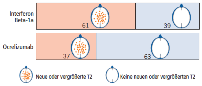 Der Anteil von Patienten ohne neue oder vergrößerte T2-Herde lag in der Ocrelizumab-Gruppe bei 63% und in der Interferon-Gruppe bei 39%.