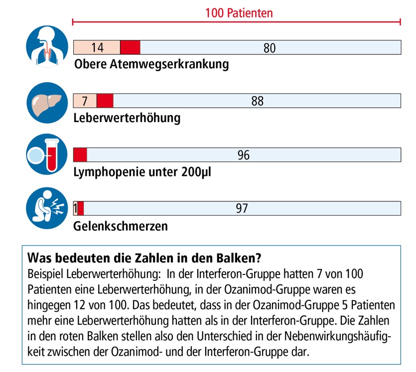 In der folgenden Grafik ist, bezogen auf 100 Patienten, dargestellt, wie viel häufiger Nebenwirkungen in der Ozanimod-Gruppe als in der Interferon-Gruppe auftraten.