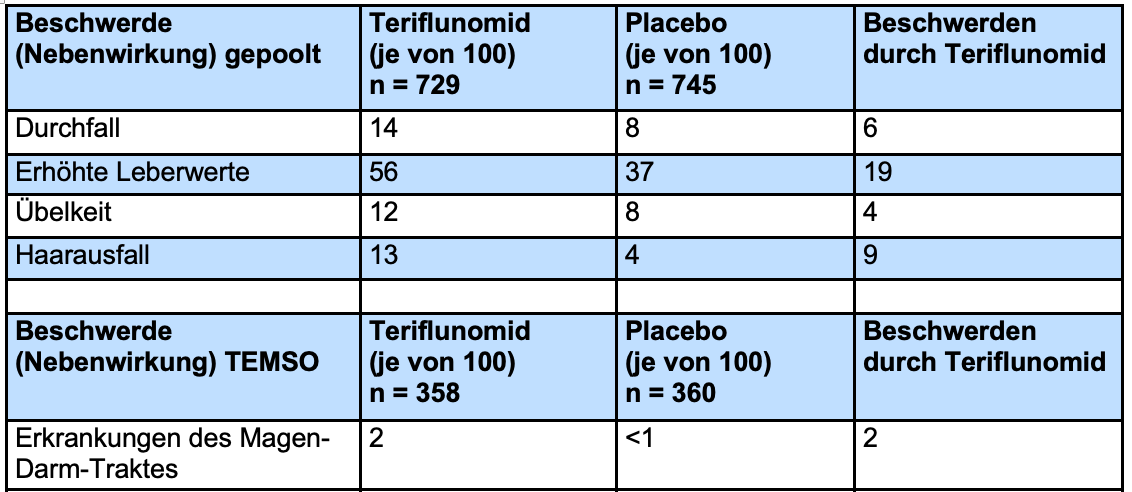 Zusätzlich zeigte sich eine Teriflunomid-bedingte Erhöhung des Blutdrucks bei 3 von 100 Patienten (5% Teriflunomid und 2% Placebo). In der TEMSO-Studie traten signifikant häufiger Erkrankungen des Magen-Darm-Trakts auf (Placebo-Gruppe <0,5% und Teriflunomid-Gruppe 2%).