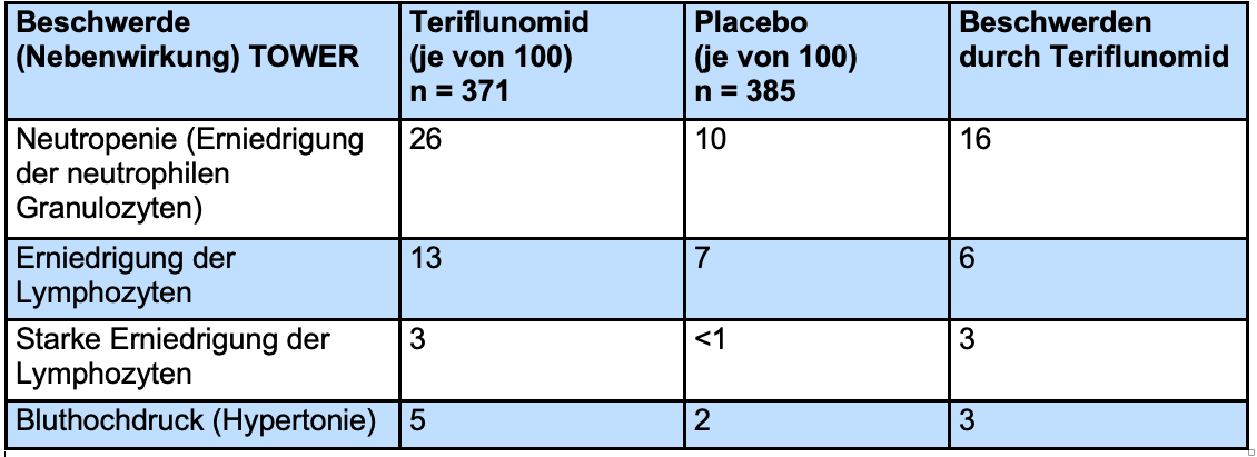Darüber hinaus gab es einige Nebenwirkungen, die nur in einer der beiden Studien berichtet wurden. In der TOWER-Studie[53] traten signifikant häufiger Erniedrigungen der Leukozytenzahlen (Placebo-Gruppe 7%, Teriflunomid-Gruppe 17%) und Lymphozytenzahlen (Placebo-Gruppe 7%, Teriflunomid-Gruppe 16%) auf.