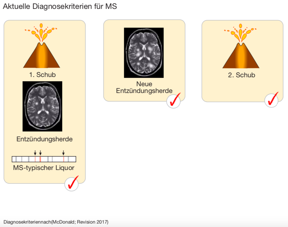 Früher war das Auftreten von mindestens zwei Schüben erforderlich, um eine Diagnose sicher stellen zu können. Dies waren die sogenannten Poser-Kriterien von 1983[4].