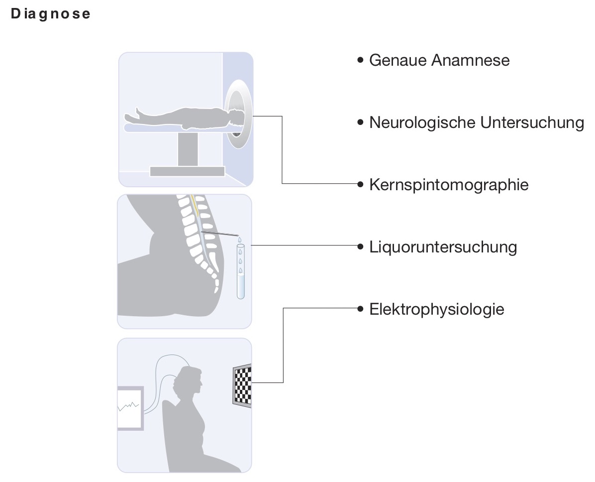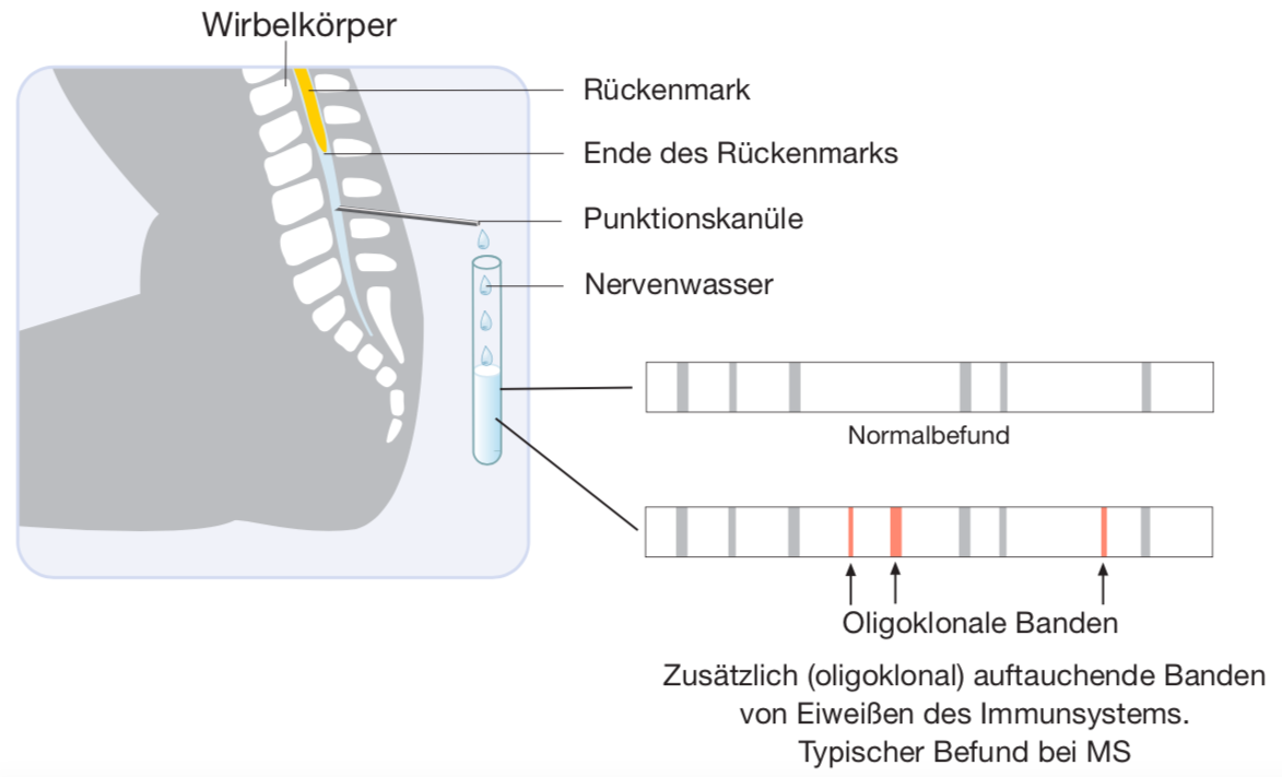 Wenn sich aus der Krankengeschichte und der neurologischen Untersuchung der Verdacht auf eine Multiple Sklerose ergibt, werden die Kernspintomographie und die Lumbalpunktion angeschlossen.