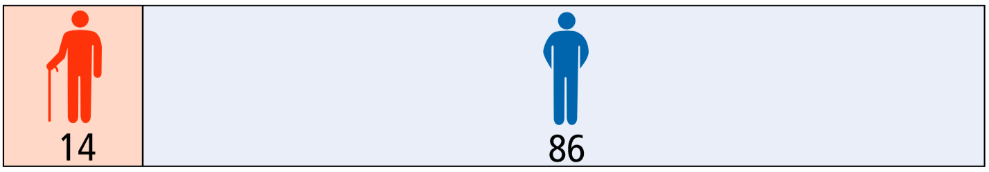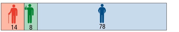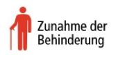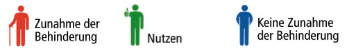 Der Balken insgesamt steht für 100 Patienten unter einer bestimmten Therapie in einer Studie. Hier wird die Hauptwirkung auf die Verhinderung der Behinderungszunahme dargestellt. Die Studienergebnisse werden zusammengefasst dargestellt. Männchen mit Gehstock werden für Zunahme der Behinderung eingesetzt. Männchen mit Händen auf dem Rücken stehen für Stabilität. Die Werte erscheinen auf 100 Patienten bezogen. Dargestellt werden: