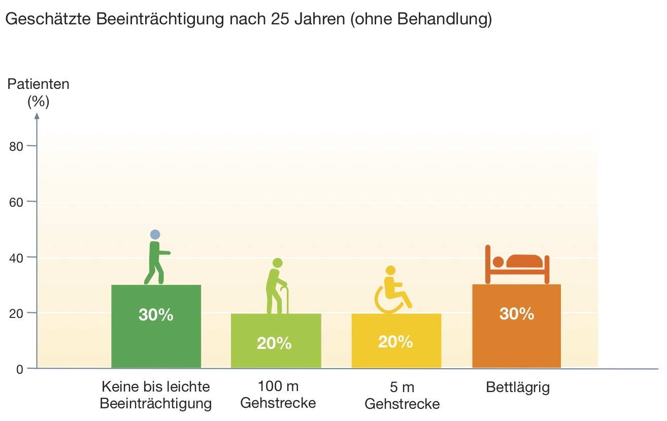 Dies wird in der folgenden Übersicht (siehe Abbildung unten) graphisch dargestellt. Es ist ersichtlich, dass in der Altersgruppe der über 50-Jährigen die Zeitspannen bis zum Erreichen der nächst höheren EDSS-Werte kürzer sind, als bei 20- bis 29-Jährigen. Somit scheint die Erkrankung in höherem Alter schneller fortzuschreiten. Patienten, die in jungen Jahren erkranken, haben jedoch aufgrund ihres länger währenden Krankheitsverlaufs im Mittel schon eine gewisse Beeinträchtigung entwickelt, wenn die älteren Patienten erst am Beginn ihrer Erkrankung stehen