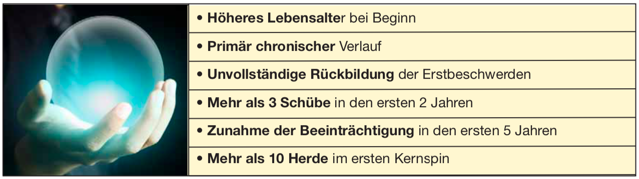 - Schübe in den ersten zwei Jahren: Einige Daten sprechen für eine ungünstige Prognose bei sehr vielen Schüben in den ersten zwei Jahren. Allerdings scheint dieser Effekt, wenn überhaupt, nur für die Zeit bis zum Erreichen eines EDSS von 4 zu bestehen.
